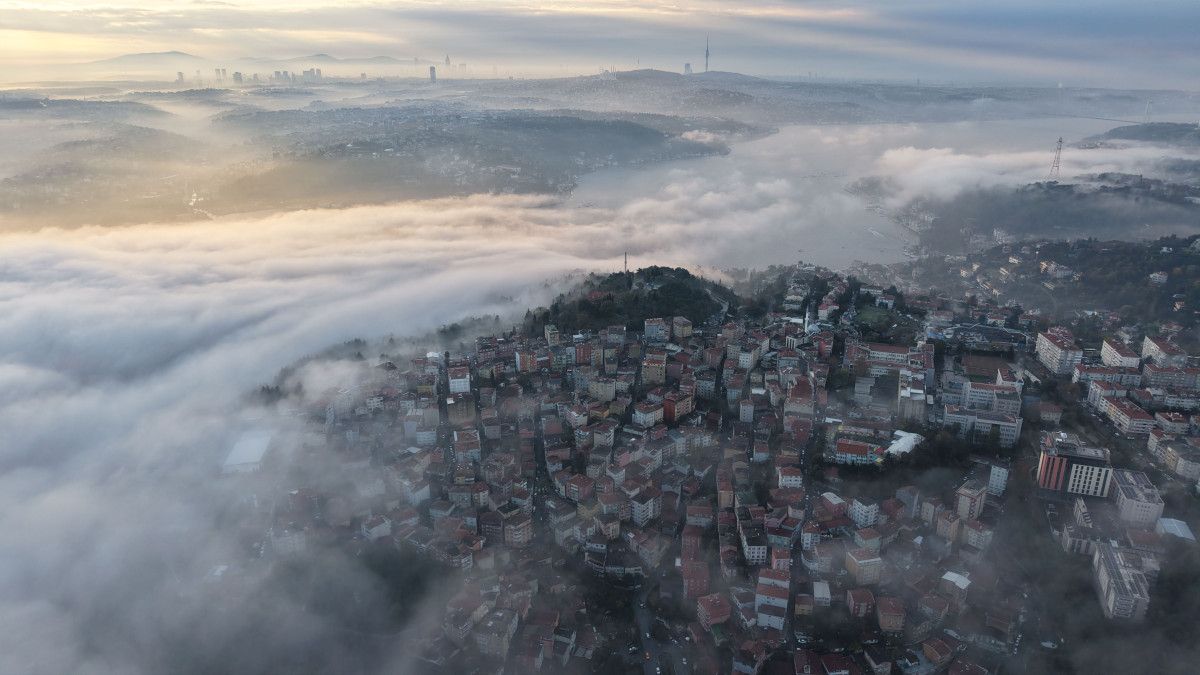 İstanbul’un bazı bölgelerinde ve boğaz çevresinde etkili olan sis havadan görüntülenirken, objektiflere yansıyan kareler nefes kesti.