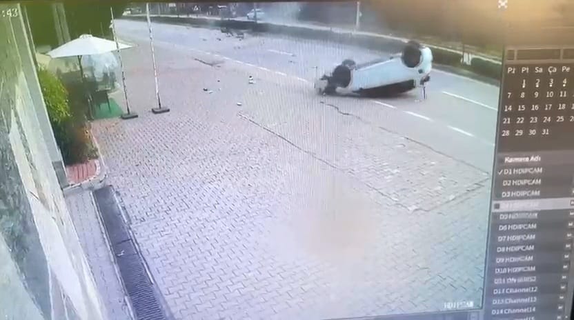 Hızla orta refüje çarpan araç, çarpmanın etkisiyle takla atarak ters döndü. Kaza anı, çevrede bulunan bir iş yerinin güvenlik kamerası tarafından saniye saniye kaydedildi.